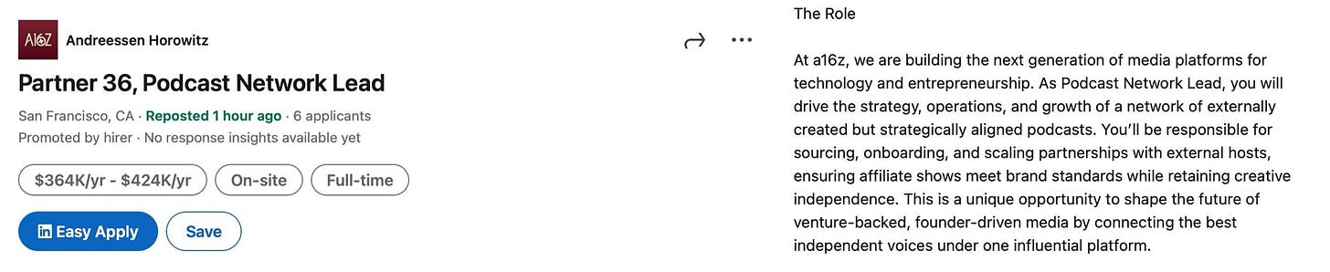 On a similar but separate note, I spotted this interesting job posting on LinkedIn - a16z is now building a podcast network -- intending on bringing indie podcasts ("externally created but strategically aligned") under their roof.