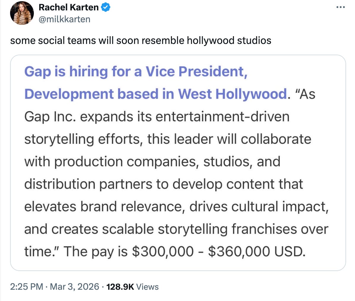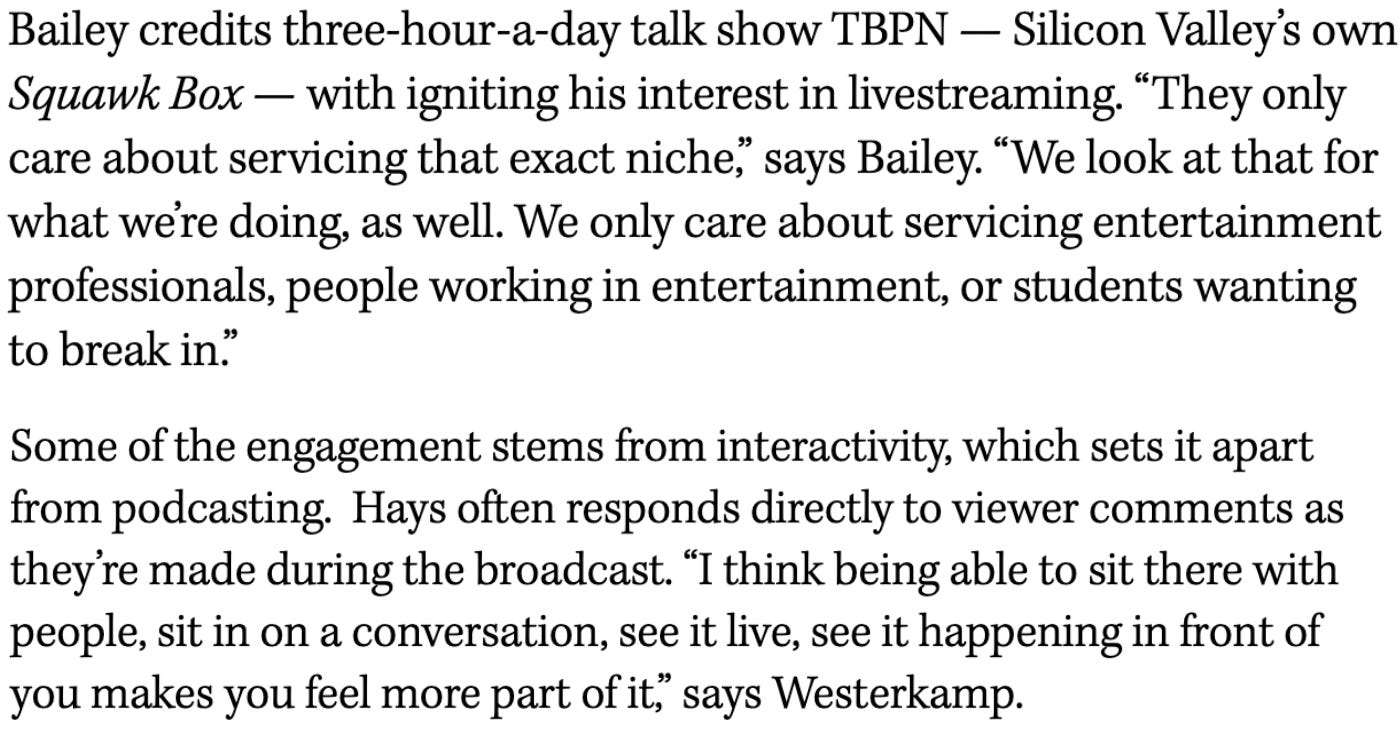 I’ve written about TBPN a bunch, but between TBPN & The Pat McAfee Show, the future of daily live-stream shows is built for Instagram / YouTube / X (where viewers can see their tweets / comments read live…they are a part of the story) and then post-stream, the video editing teams will fire off the clips that flood your feed.