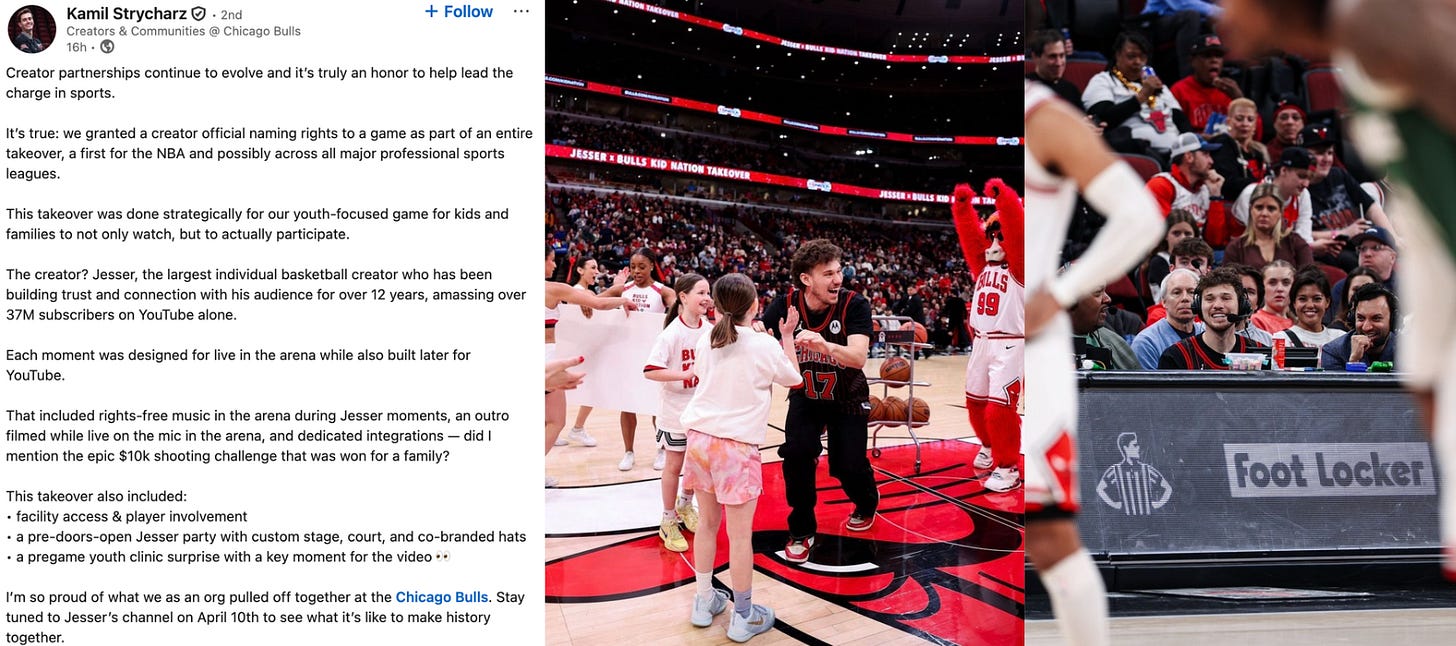The Chicago Bulls had the NBA’s first “Creator Game Takeover” with YouTuber Jesser (37m subscribers). A pioneering initiative; this is awesome for the game, awesome for kids, and shows us the power that content creators have in 2026.