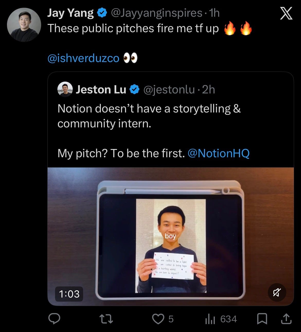 Shoutout to this kid Jeston for finding a really creative way to pitch Notion to be an intern…these social media platforms are your outlets.